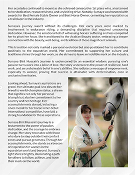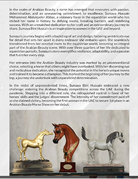 Sumaya Bint Hussain is a distinguished figure in the Emirati community, a woman of vision, discipline, and deep cultural pride. As the founder of SAS Stable, creator of Ayesha Brand, and a passionate artist, she represents the perfect harmony of strength and elegance. Her life’s work bridges tradition and modernity, inspiring women across the Arab world to dream boldly and rise with purpose.